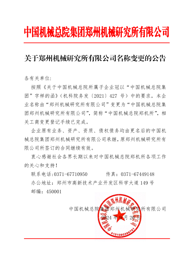 關(guān)于鄭州機(jī)械研究所有限公司名稱(chēng)變更的公告
